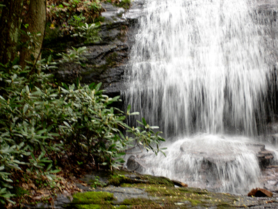 The upper falls (shown below) are the actual DeSoto Falls . The ascent is easy, rolling up and down, broken by long flat stretches in deep wood groves. Occasionally the visible creek makes a soothing gurgle and the falls themselves are worth the trip. Just before you reach these falls you cross a bridge, then turn into the side cove containing the falls. A brief ascent takes you to the observation deck. | |
