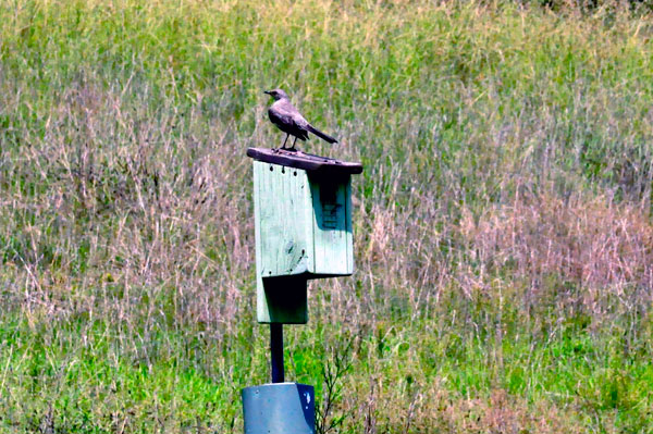 Below: A bird on a birdhouse |