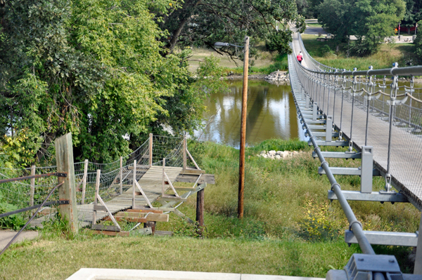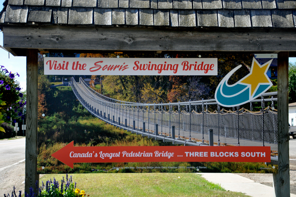 The Souris Swinging Bridge is Canada’s longest historic suspension bridge measuring 604 feet or 184 metres. It was built in 1904 by Squire W.H. Sowden as a convenience to access his property on the east bank of the river which he had allocated as farm land for grazing livestock. Sowden donated the bridge to the town in 1907 and it has evolved to become the centre of the community over the years. |