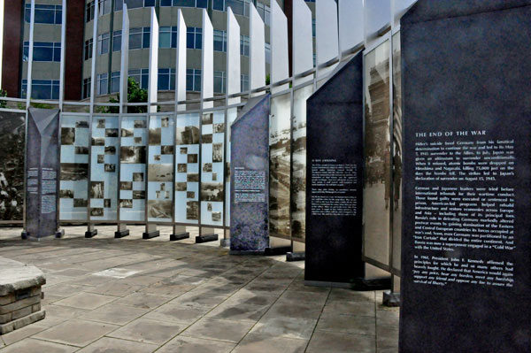 The tall black signs are granite narrative panels. The last one on the right in the panorama photo above says "The War Begins". So if you enter at the memorial sign and American Flag and walk to the right, you will first read the narrative panel "The War Begins." even though it is on the right end of the panorama and appears to be last. |