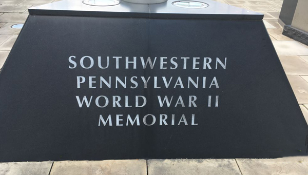 Below: The Southwestern Pennsylvania World War II Memorial sign shown above is actually 3 sided. The other two sides are shown below, first in a 2021 photo and then below that, each side in separate 2025 photos. |
