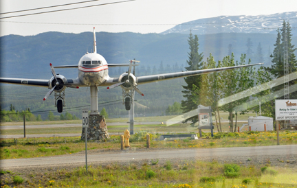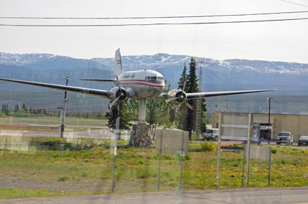 Below: A DC-3 weathervane at the airport is a Whitehorse landmark. It actually spins in the wind. The photos were taken through the window of the moving RV, thus the reflections.