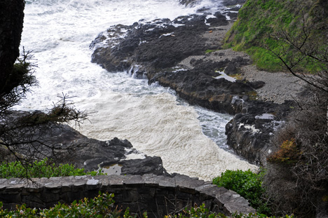 Below: Pulverizing and pounding. Crashing and smashing. Endlessly, relentlessly, the Pacific ocean careened into Devils Churn until the crescendo of waves exploded in a riot of white froth.... and then escaped back to the sea. | |
