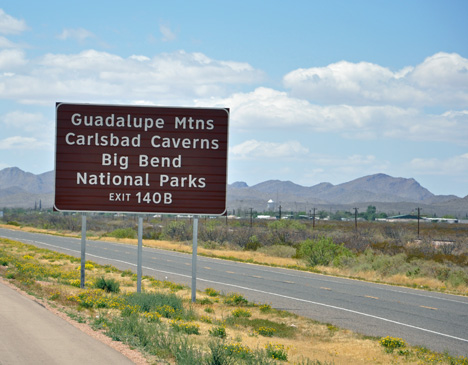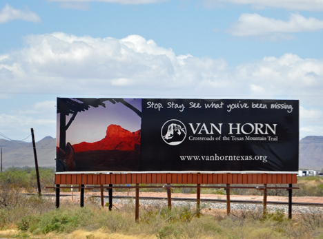 Below: Entering Van Horn Texas. Van Horn sits astride I-10 and is the hub of the Texas Mountain Trail. Within 50-200 miles there are many National Parks, state parks and historic sites including Guadalupe Mountains National Park, Carlsbad Caverns National Park, Fort Davis National Historic Site and State Park, Big Bend National Park, Balmorhea State Park, and McDonald Observatory. Van Horn has 15 motels, 3 RV Parks, 16 restaurants and 9 service stations. Van Horn is in Culberson County, the 5th largest county (in square miles) in Texas. The county is larger than the state of Rhode Island. Elevation ranges from 8,751 feet to valley floors at 3,000 feet. | |